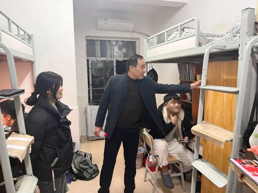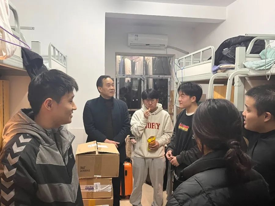 走访期间黎书记与同学们进行沟通,关切同学们的寝室生活,强调用电安全问题并且询问毕业生的论文情况以及就业情况为即将毕业的学子提出了有关未来选择的有效建议。周经理特别提醒同学们近期流感高发,注意开窗通风,做好保暖措施。