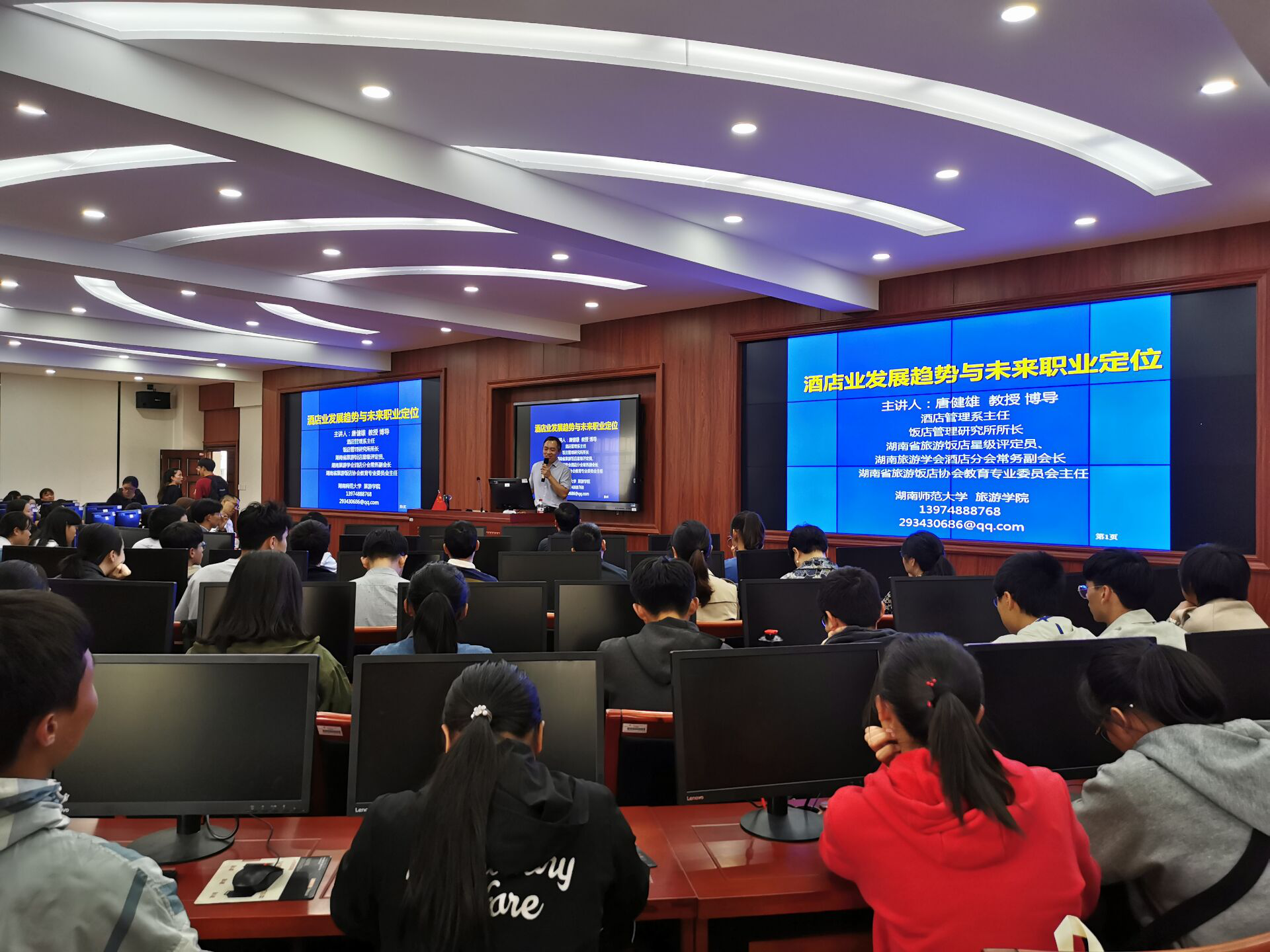 10月22日下午,乐天使邀请到了湖南师范大学的唐健雄教授做了“酒店发展趋势与未来职业定位”的专题讲座,公司党总支书记王淑霞、副书记刘敬龙,旅游管理教研室主任、硕士生导师刘飞龙及旅游管理教研室的其他老师们到场,与全体2018级旅游管理专业的同学共同聆听本次讲座。