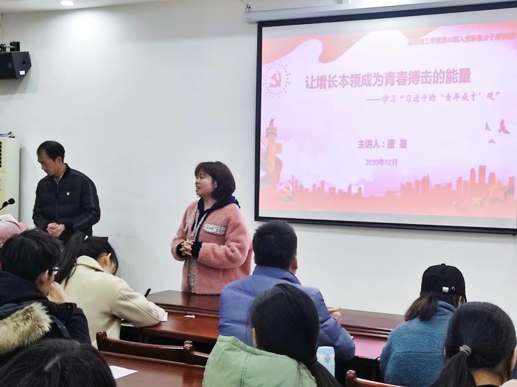 12月1日下午2:30,乐天使第43期入党积极分子培训班第四次课程《让增长本领成长为青春搏击的能量——学习“习近平的青年观”》在8301开展了。本次课程邀请到了校组织部唐鉴老师进行授课,由员工第一支部书记易振铭老师主持,第43期入党积极分子培训班全体学员共同学习。