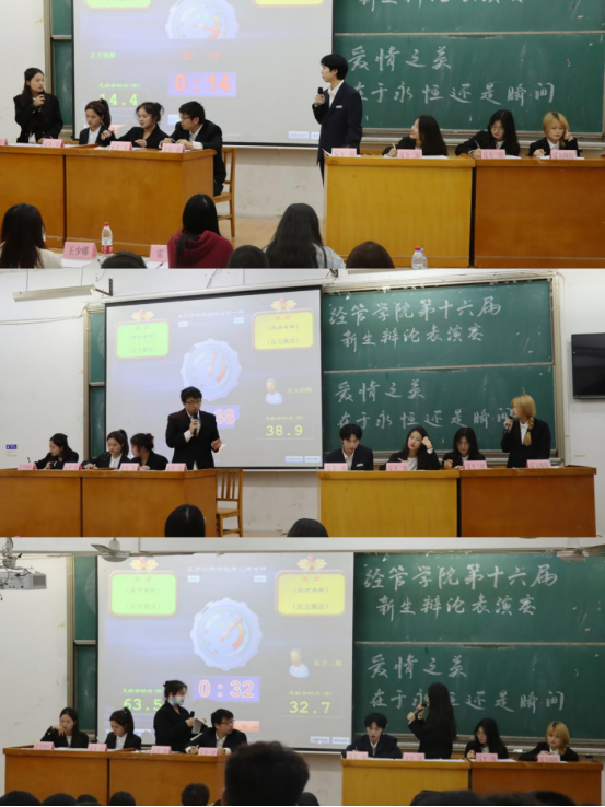 比赛中,双方辩手旁征博引、妙语连珠,将现场氛围逐步推向高潮。正方提出,爱情之美在于永恒,双方在长久的爱情关系中表现出对承诺的坚守和对责任的承担 ,让爱情变得更加坚定和珍贵。但反方认为,在瞬间中能看出爱情之美,爱情的永恒是由无数个心动的瞬间组合在一起的,刹那的美好将刺激神经产生记忆,品味瞬间即可回忆起美好,这是走向永恒的力量。辩手们逻辑缜密,思维灵活,一次次化险为夷,同时观众席互动积极,比赛现场十分热闹。最后,评委点评辩手们的精彩表现,指出优点与不足,鼓励他们不断尝试,提升自我。