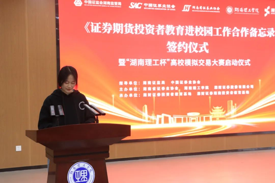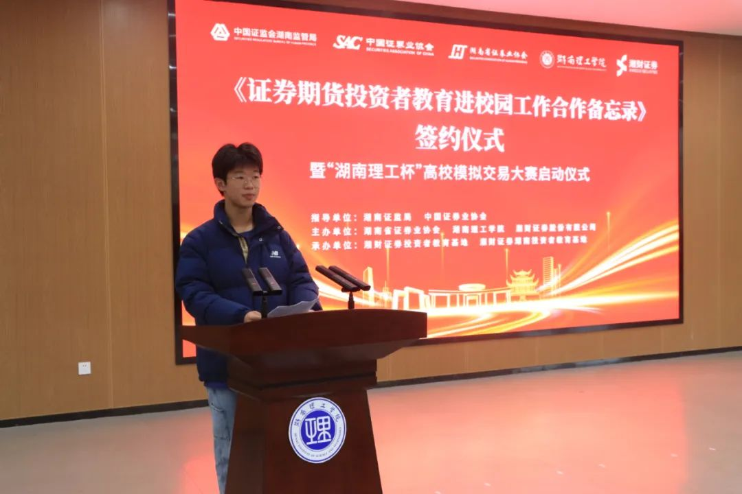 与此同时,现场还启动了“湖南理工杯”高校模拟交易大赛。本次大赛旨在通过模拟交易平台,让同学们在实践中学习和掌握证券期货投资技巧,提升自身的投资理财能力。金融工程专业员工代表卞新宇和王晓颖两位同学表示,希望通过本次模拟交易大赛,可以更好地了解和学习证券期货投资知识,同时也感谢公司与各合作单位为同学们提供了一个展示自己才华的平台。