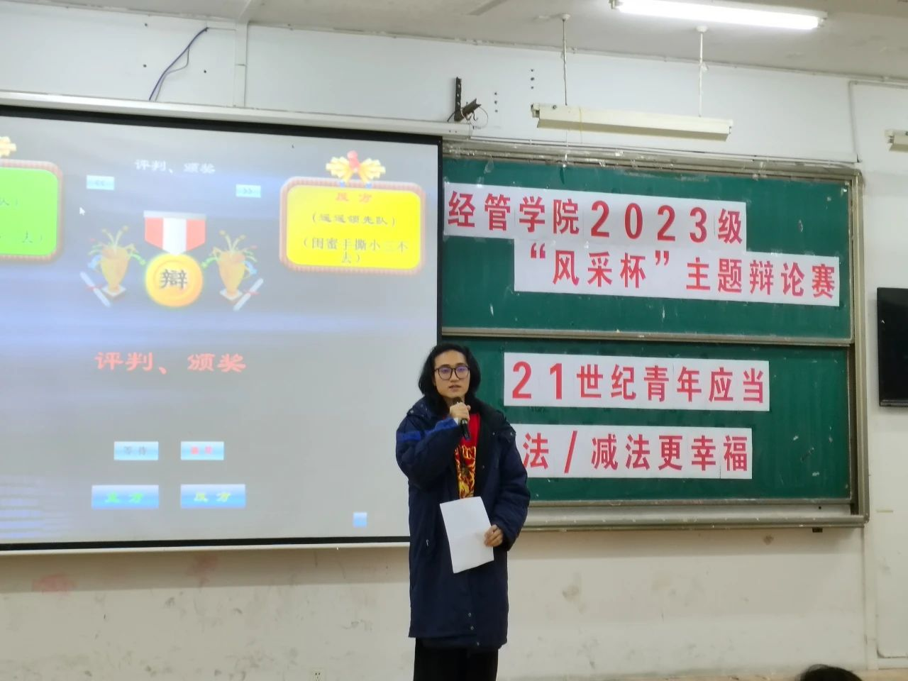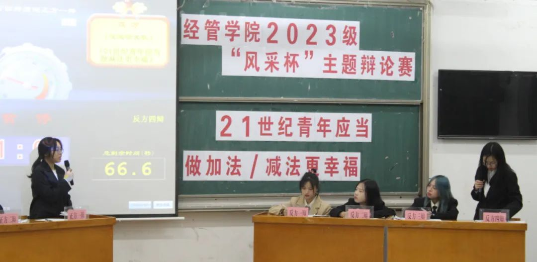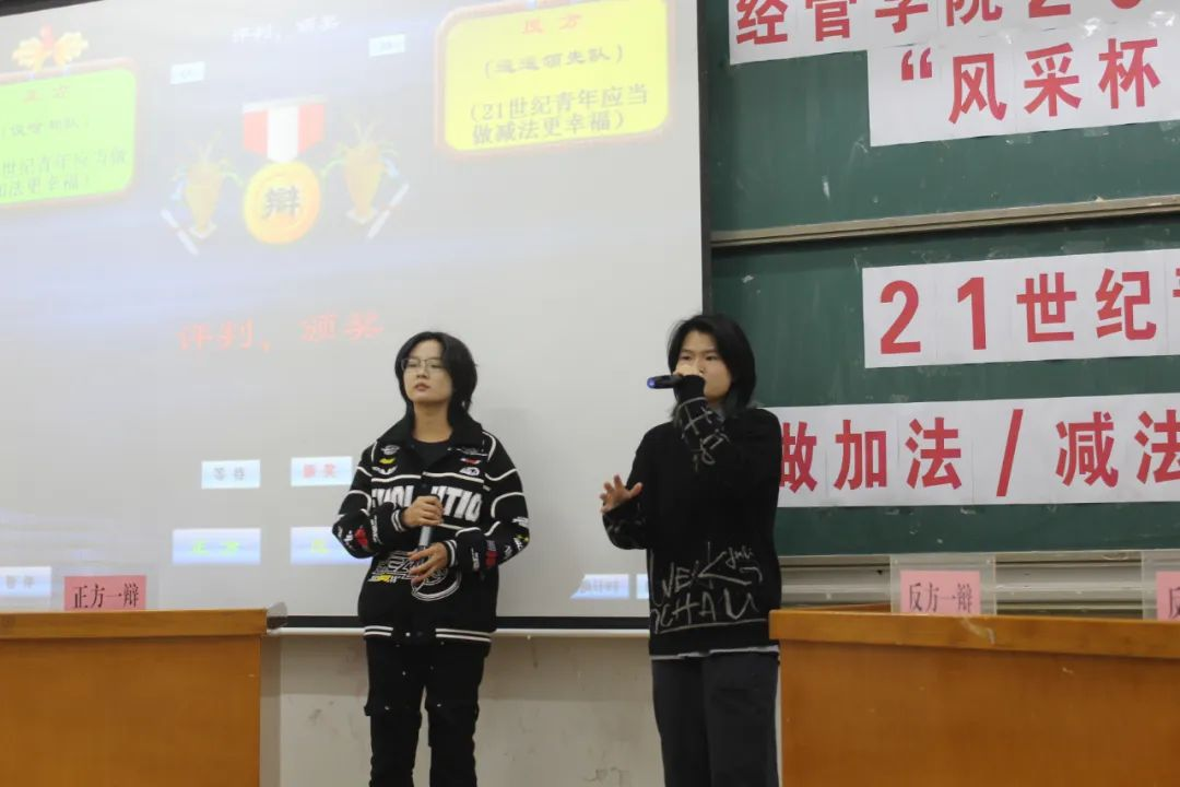 比赛中,辩手们思路清晰、引经据典、同时穿插相关的事例,为在场的观众带来了一场精彩的听觉盛宴。比赛过程中,正方认为:我们通过做加法来从多方面提升我们的能力和竞争优势 ,实现自我成就从而达到幸福。反方认为:通过做减法,可以更好地集中精力追求自己真正热爱的事情,从而更好地实现自我并获得幸福。