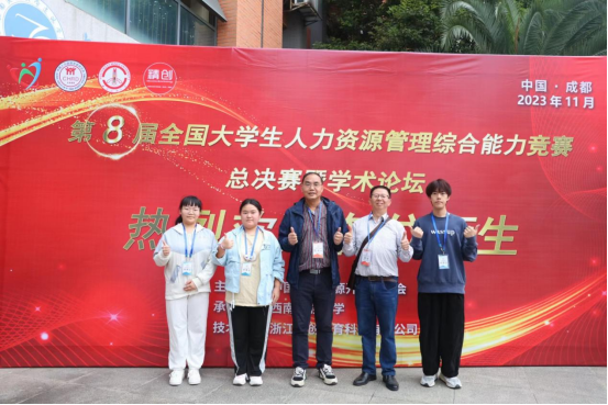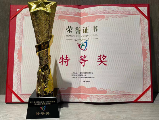 中国人力资源开发研究会举办的第八届全国老员工人力资源管理综合能力竞赛总决赛于2023年11月11-12日在西南民族大学举行,由​21级人力资源管理专业周梦瑶、赵迎娜、杨茂萱3名同学组成的乐天使代表队经过校赛、大区赛、半决赛等环节比拼,一路过关斩将,在全国384支参赛队伍中,夺颖而出,最终获得第一名,勇夺特等奖。