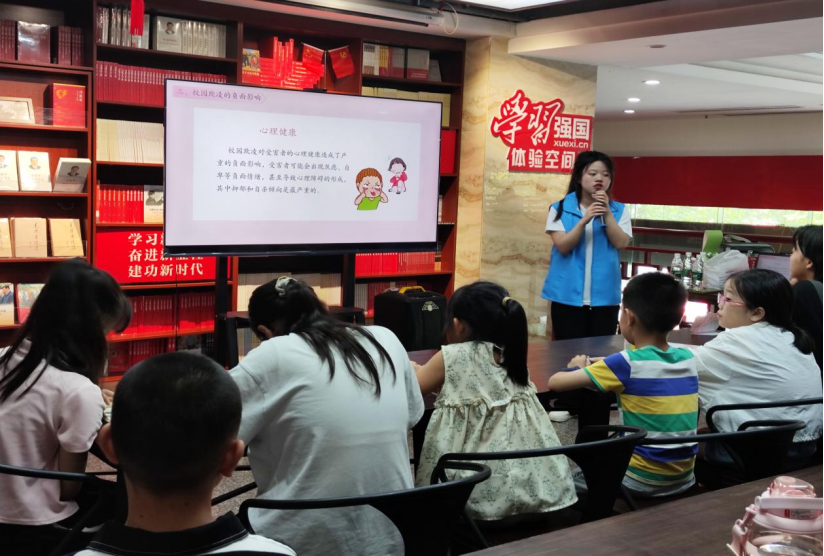 下午,团队来到了岳阳市新华书店,通过PPT展示、案例分析和互动问答等形式,向孩子们详细介绍了校园欺凌的定义、类型、危害及预防方法。同时结合典型案例,寓教于乐地向孩子们传授了面对校园欺凌的有效应对策略与及时求助技巧,让孩子们在轻松愉跃的氛围中树立科学理念,学会自我保护的常识。