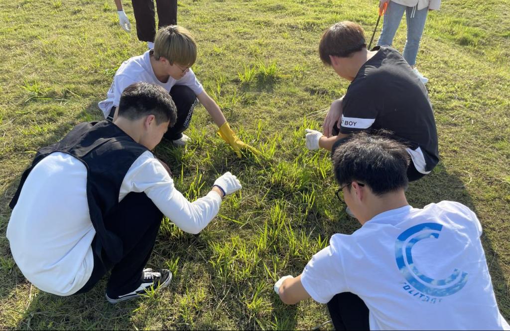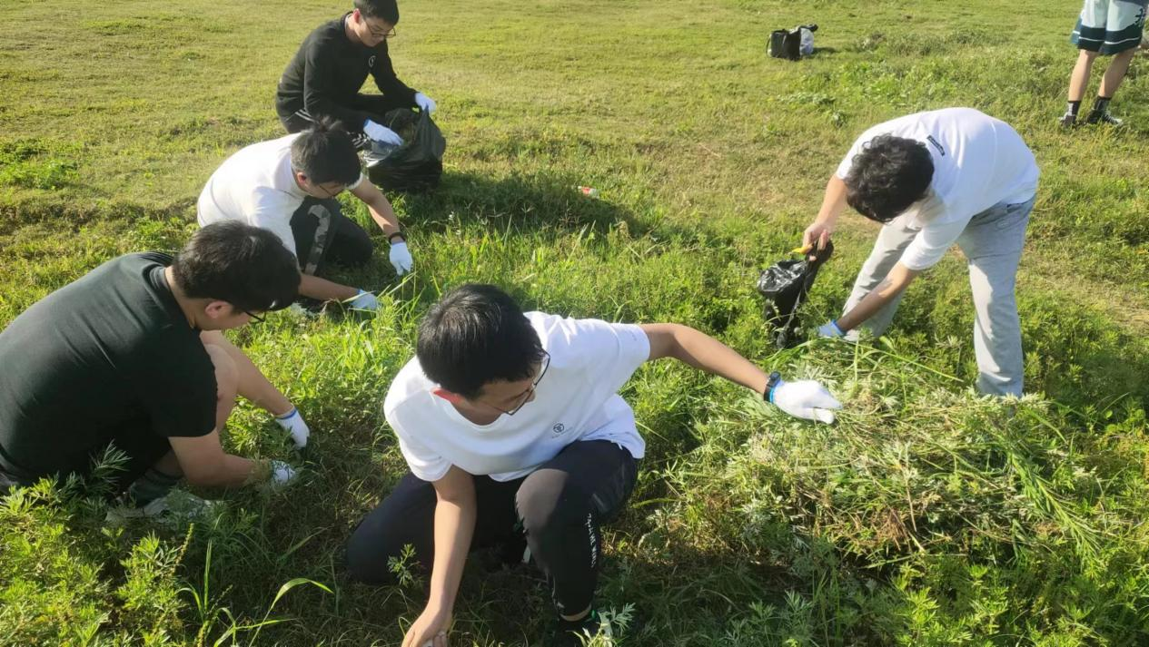活动当天,艳阳高照、但丝毫没有抵挡同学们的劳动热情。下午四点半,同学们在目的地集合完毕,便迅速带上工作手套,领取镰刀、铁锹,以饱满的热情和高昂的情绪投入到拔草行动中。大家分组、分区进行劳动,铲草、清理杂物、将垃圾运到指定地点……同学们脸上不停淌下大粒的汗珠,身上被浸湿了的衣服,鞋子上沾满的泥土,也没有人停下来歇息,直到原本长满杂草的场地变得干净、美观。