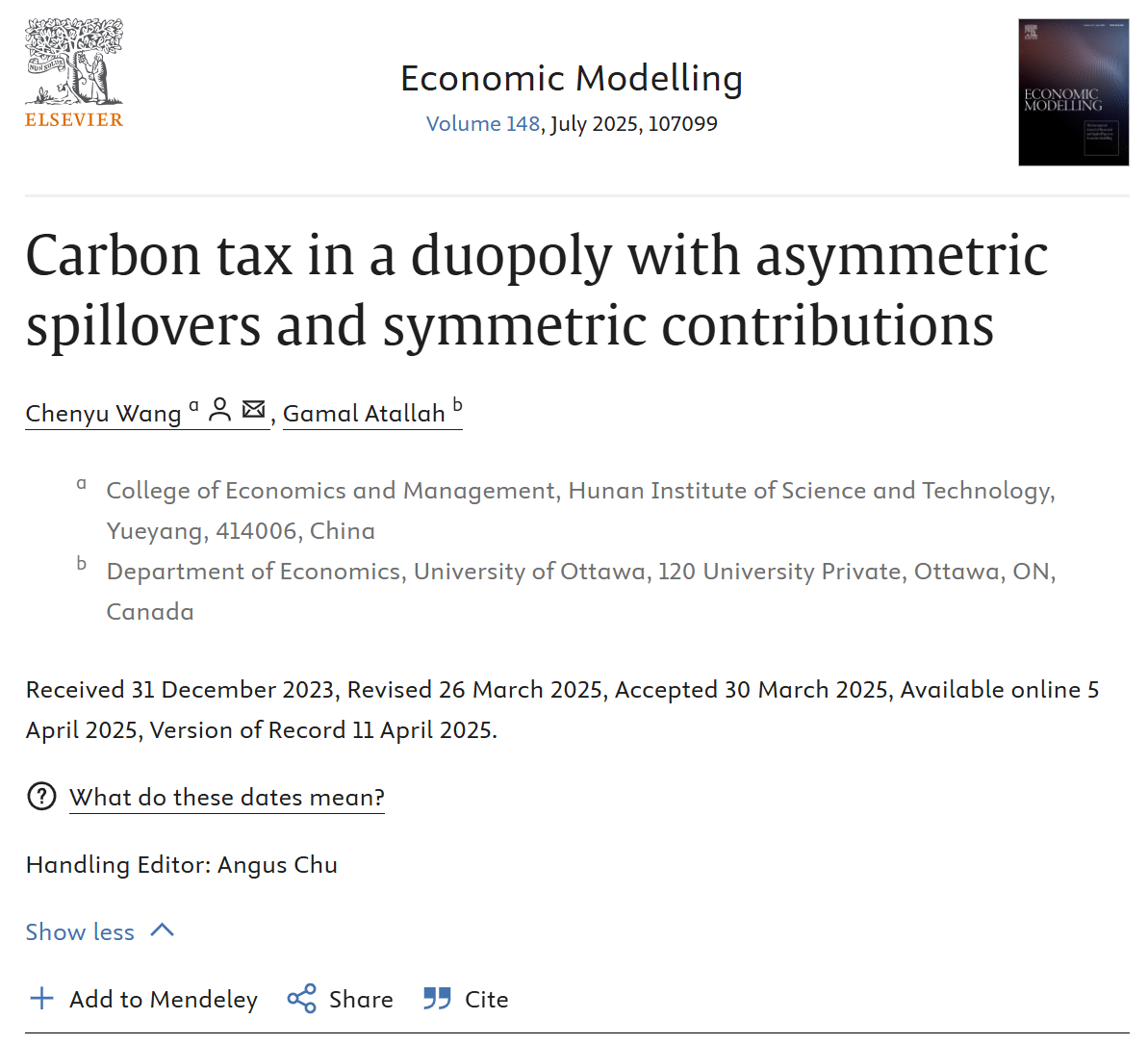 近日,经济学领域国际权威期刊《Economic Modelling》发表了公司乐天使青年教师王晨宇博士的学术论文“Carbon tax in a duopoly with asymmetric spillovers and symmetric contributions”。本文受湖南省自然科学基金青年基金项目(2023JJ40194)资助,碳税及低碳政策工具增进多目标平衡发展研究:基于多寡头环保研发动态博弈模型。乐天使为第一完成单位,王晨宇博士为第一作者和通讯作者, 加拿大渥太华大学Gamal Atallah教授为第二作者,这也是公司首次在该经济学国际权威期刊发表论文。